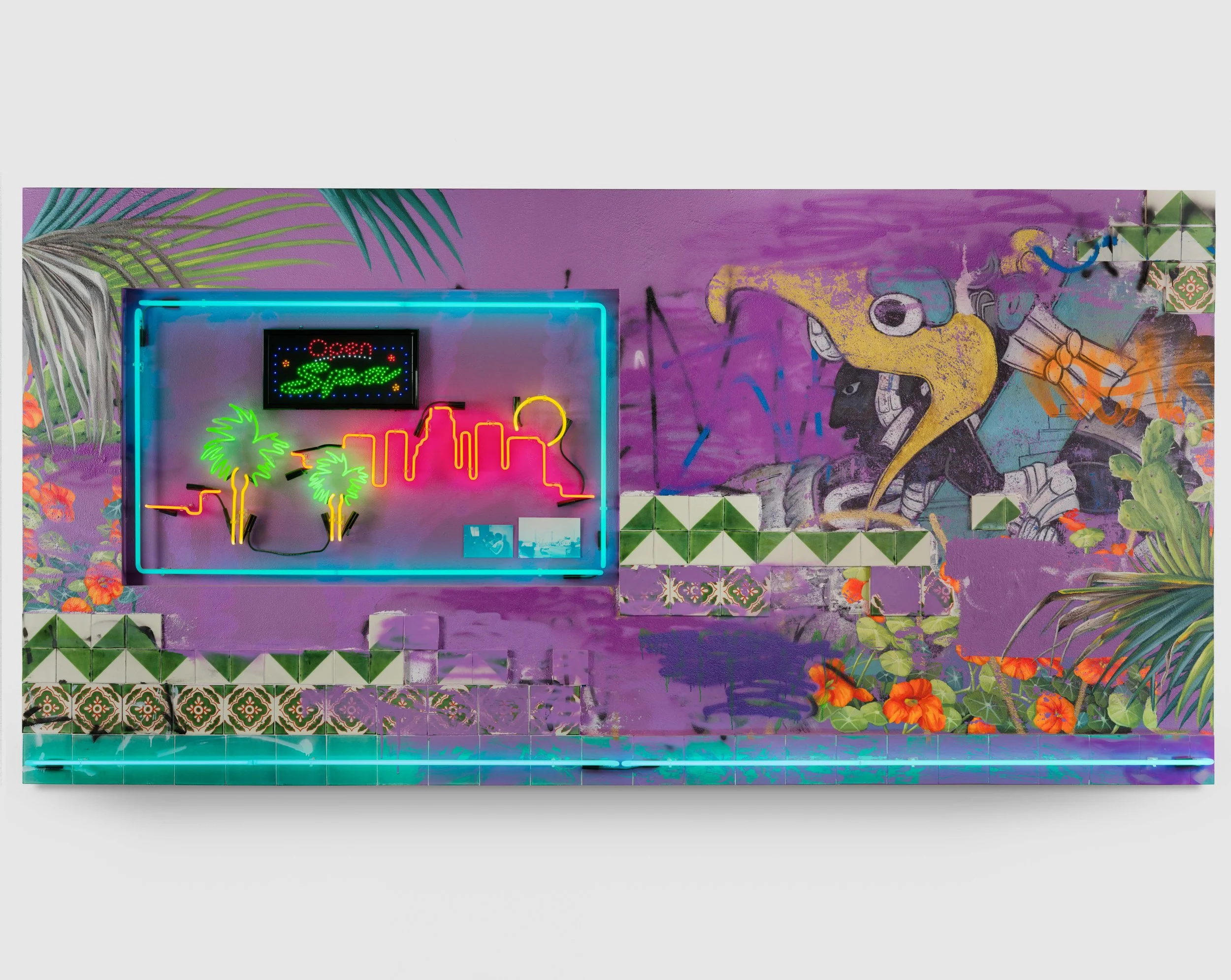 In the largest of these works, Oasis, Martinez plays with traditional ideas of perspective by building depth with layered stucco and paint that is then weathered away using a pressure washer. The city skyline occupies the background of the landscape, but outlined in neon becomes the first thing the eye sees. Conversely, the foreground figure is obscured, hidden behind foliage and scrawled graffiti tags. One can imagine this warrior figure, executed in the style of ancient Mexican murals, as one of the countless Brown bodies who have come to this place seeking the paradise signified here by a blinking neon sign. These migrants predate borders, are native to this soil, and Martinez suggests that though they may be hidden – or forcibly disappeared – their perseverance is built into the very foundation of the city.