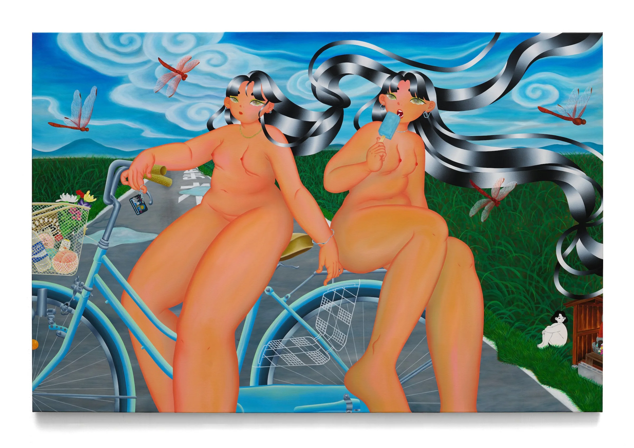 These seven paintings follow their two subjects through daily activities that also traverse the ancient and the modern. They joyfully ride bikes through fields of rice paddies, their basket brimming with Obon season offerings for the ancestors. Obon, a tradition combining the ancient Japanese belief in ancestral spirits with the Buddhist custom of honoring ancestors, is a time when families gather to clean their family burial places and make offerings there. The figures in Fuji’s painting carry fruit, snacks, and flowers in the basket of their bike, suggesting that they are making Obon season offerings.
