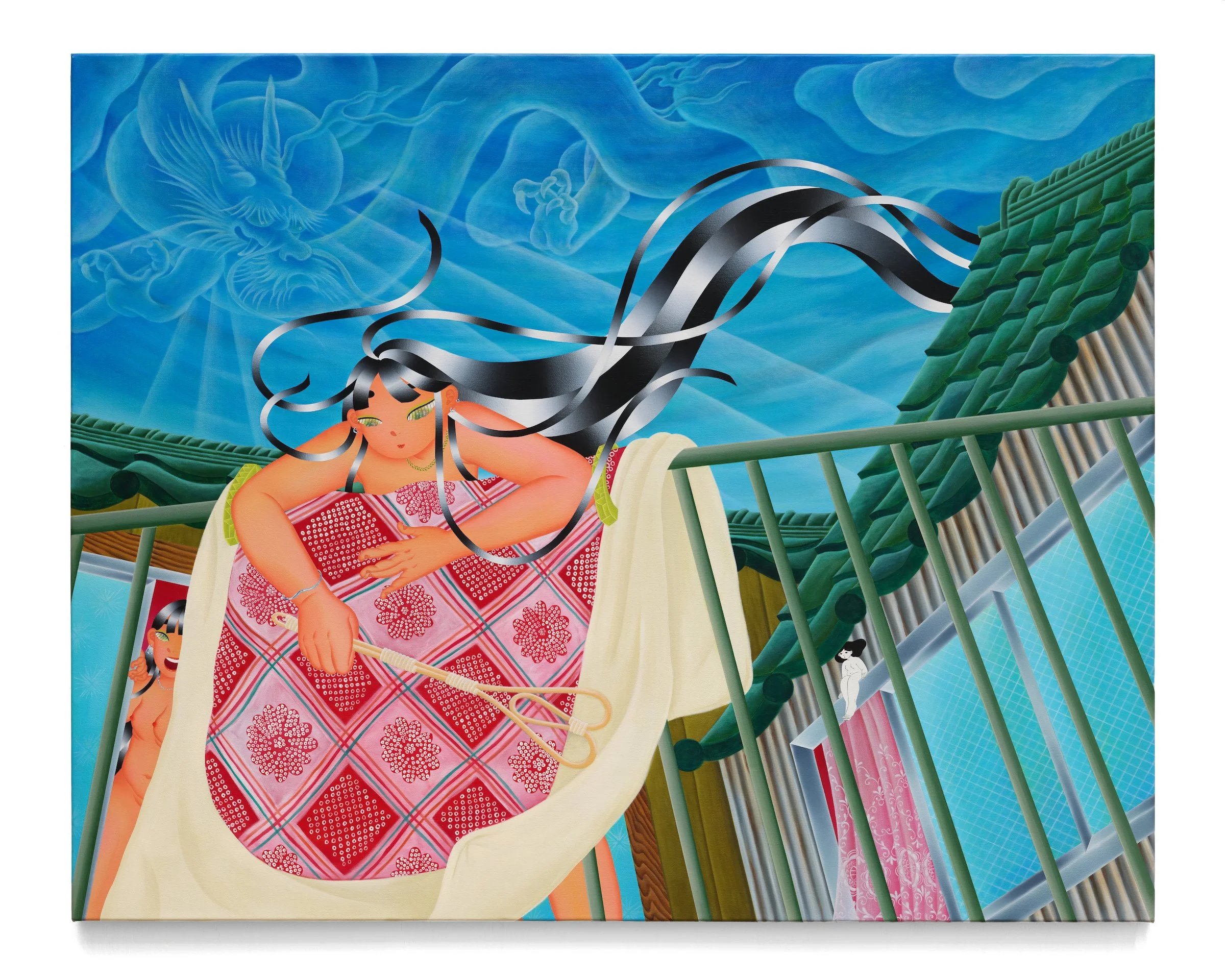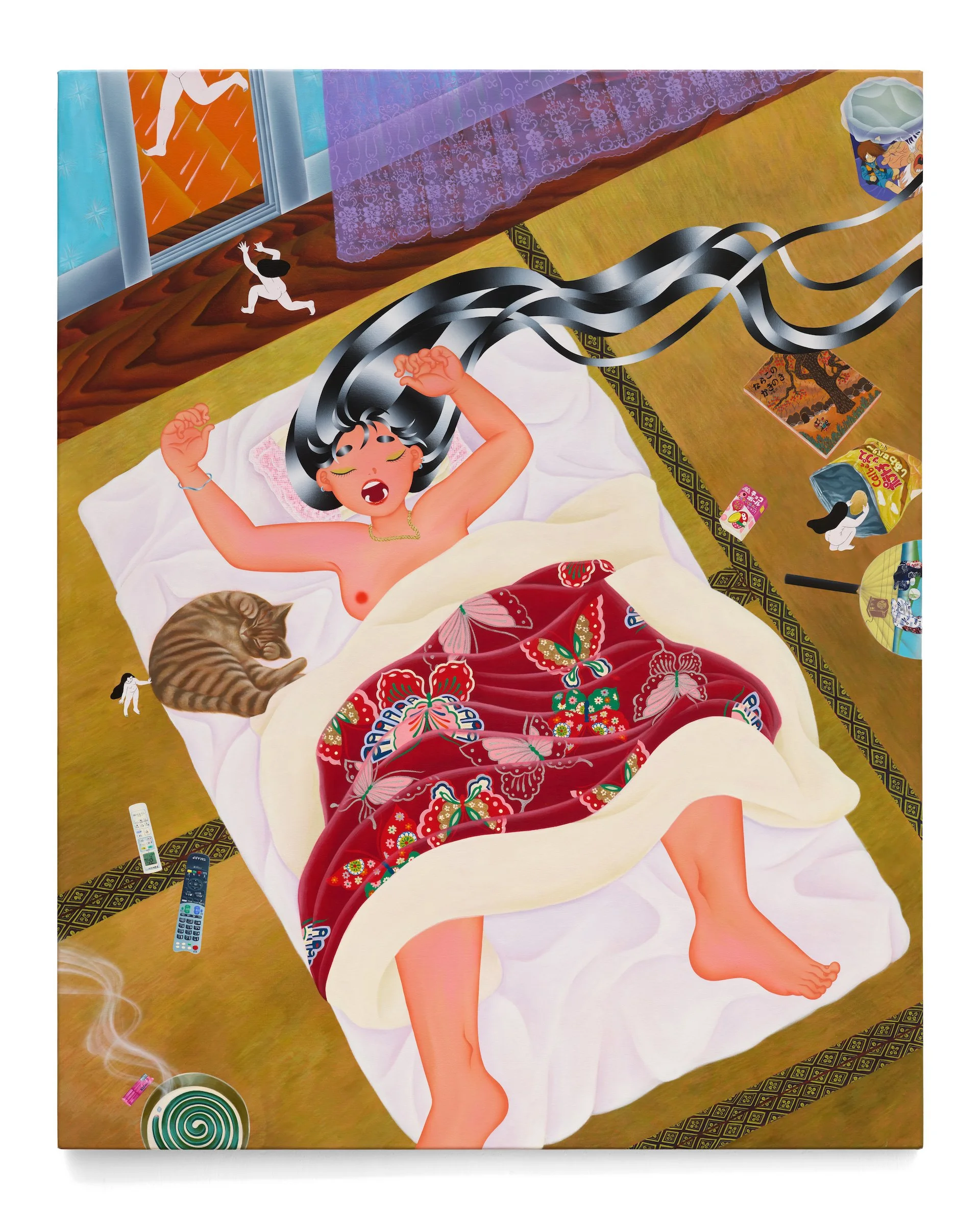 The quotidian scenes of Slice of Life are infused with the ever-near presence of ancestors and spirits. Whimsical Tsukumogami scurry through the paintings, small manifestations of the spirits gained by objects through the centuries. In 1PM: Clean·龍神と晴れ女, an ethereal dragon coalesces out of cloud, a watchful manifestation of Hirota Hyakuhō’s painting of the dragon Ryū No Zu that graced the Kanazawa Shrine throughout the artist’s childhood. Born during the year of the dragon, Fuji visited the painting often and felt protected by its presence. In 1PM: Clean·龍神と晴れ女, the dragon appears in his guise as the god of rain, clearing the skies to allow for the simple pleasures of airing out the bedding from 10AM: Alarm Goes Off·二度寝.