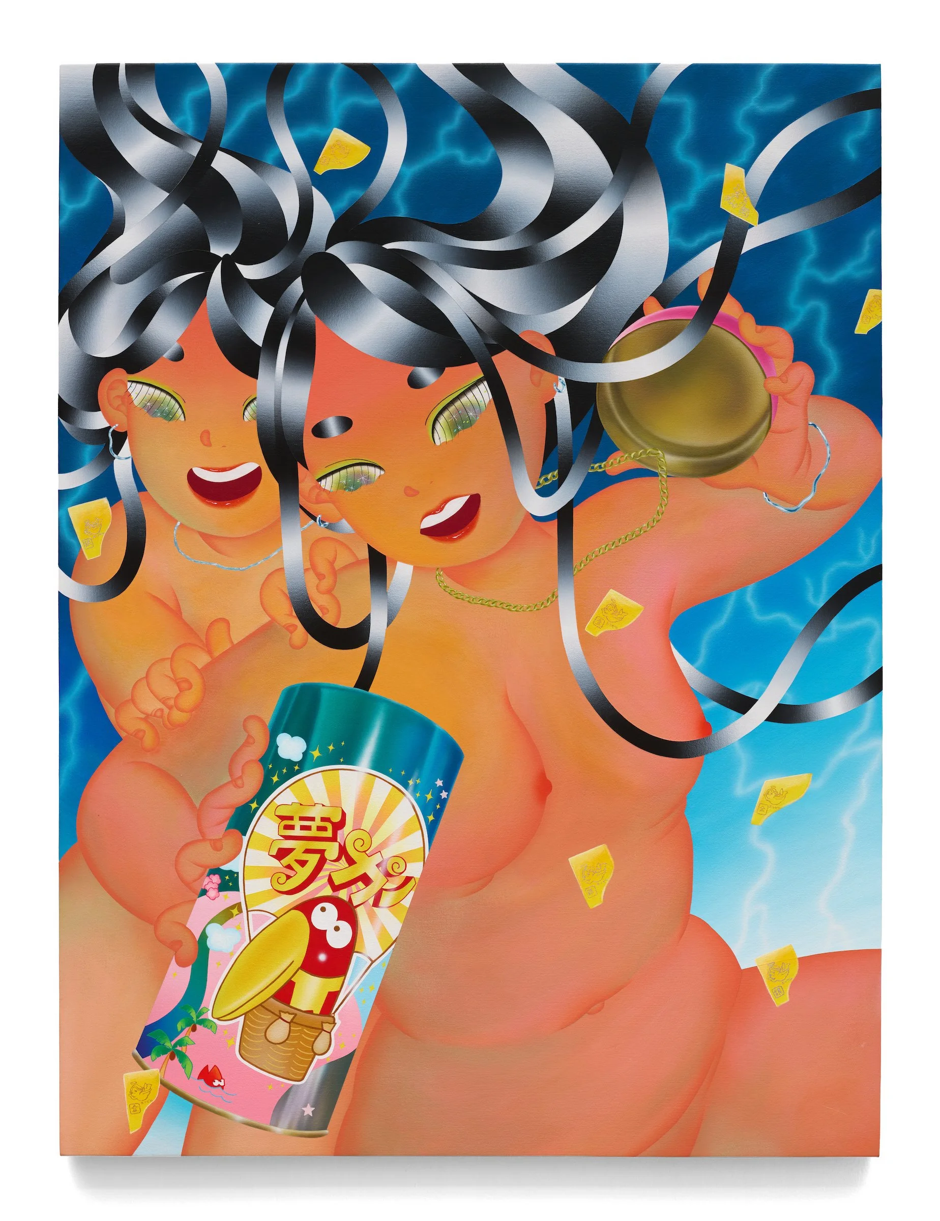 This new body of work leans into Fuji’s interest in manga illustration. Capturing a time before the internet permeated daily life, her figures feel joyfully present in their bodies. These figures are heavily influenced by both manga and Ukiyo-e, physiques plush and soft like the “beautiful women” of Tsukioka Yoshitoshi’s 19th-century Bijin-ga paintings or depictions of the Buddha, with large, sparkling eyes and flowing hair that call to mind manga artists such as Takahashi Rumiko and Ikeda Riyoko. This fusion of art historical and contemporary sensibilities forms a key aspect of Fuji’s project, merging past and present approaches to figuration and narrative painting in works embedded with personal stories and familial memories.